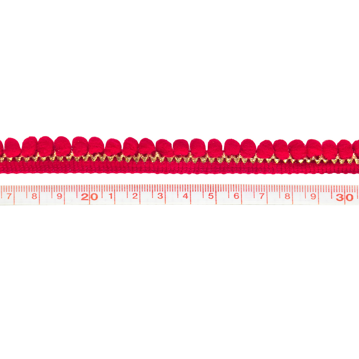 Galon de mini pompon rouge à la base brodée d'un ruban doré