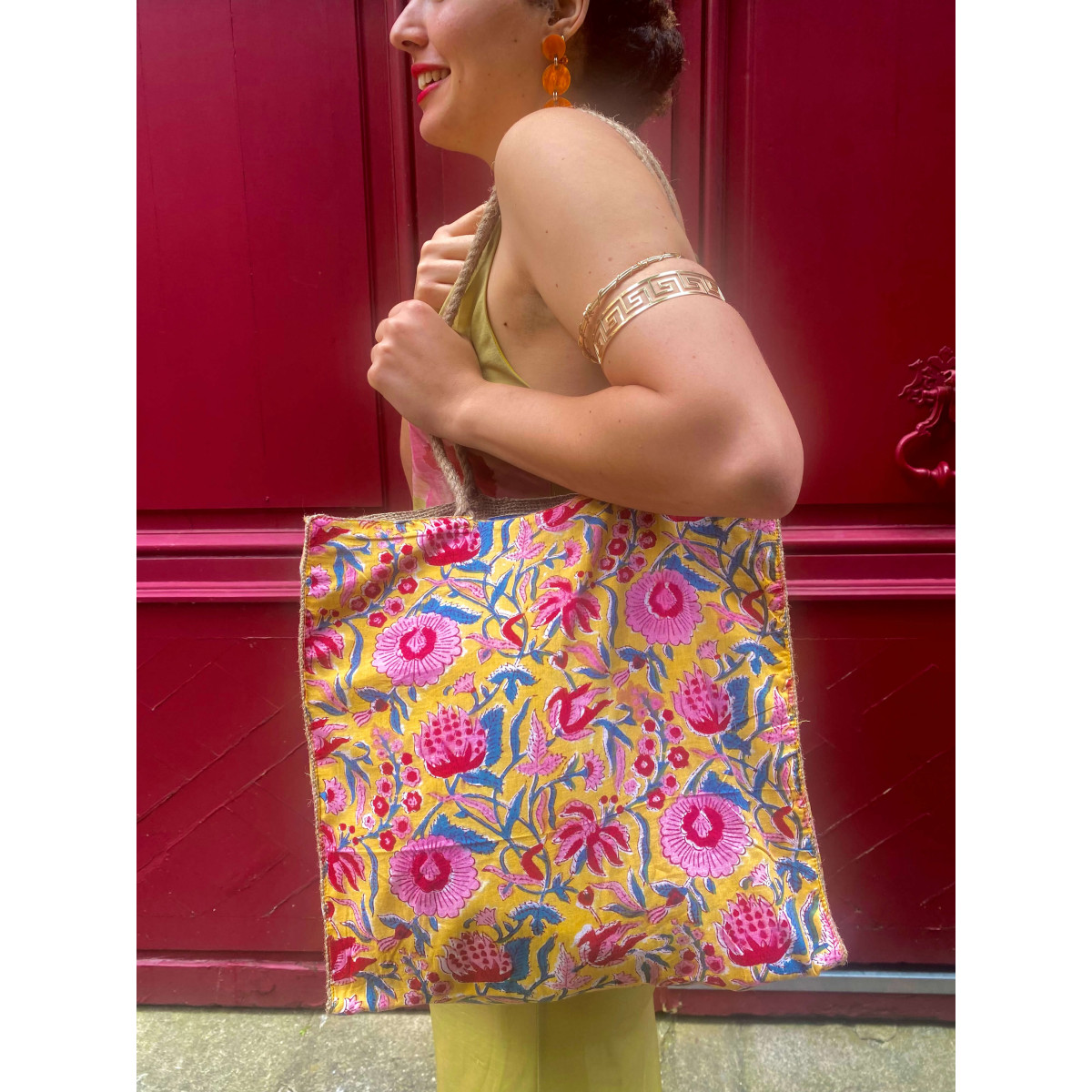 Le sac cabas en toile de jute "Ludhiana" se distingue par ses couleurs vives et son design fonctionnel. Utilisez-le pour vos achats, pour la plage ou pour des documents encombrants. Ce tote bag robuste et élégant est fabriqué avec un extérieur en coton imprimé et un intérieur en toile de jute souple.