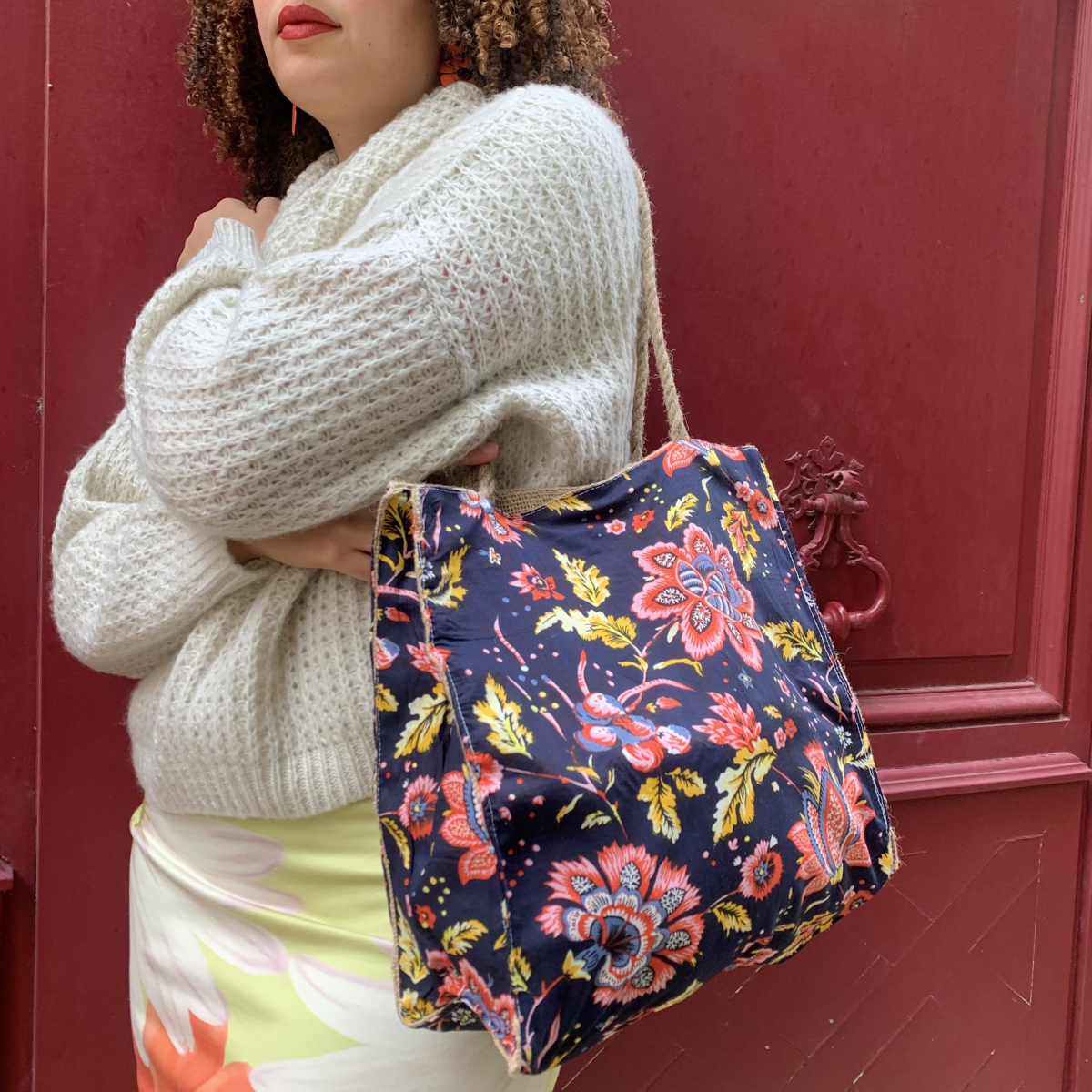 Le sac cabas en toile de jute combine praticité et style avec un design floral coloré.
