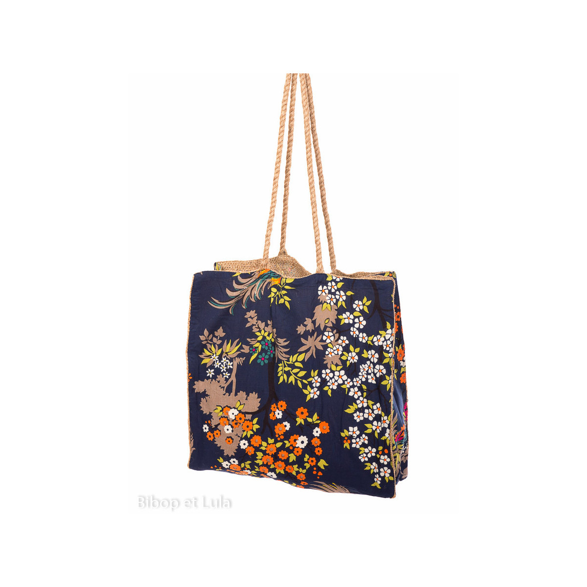 Extérieur en coton imprimé, intérieur et anses en toile de jute souple .