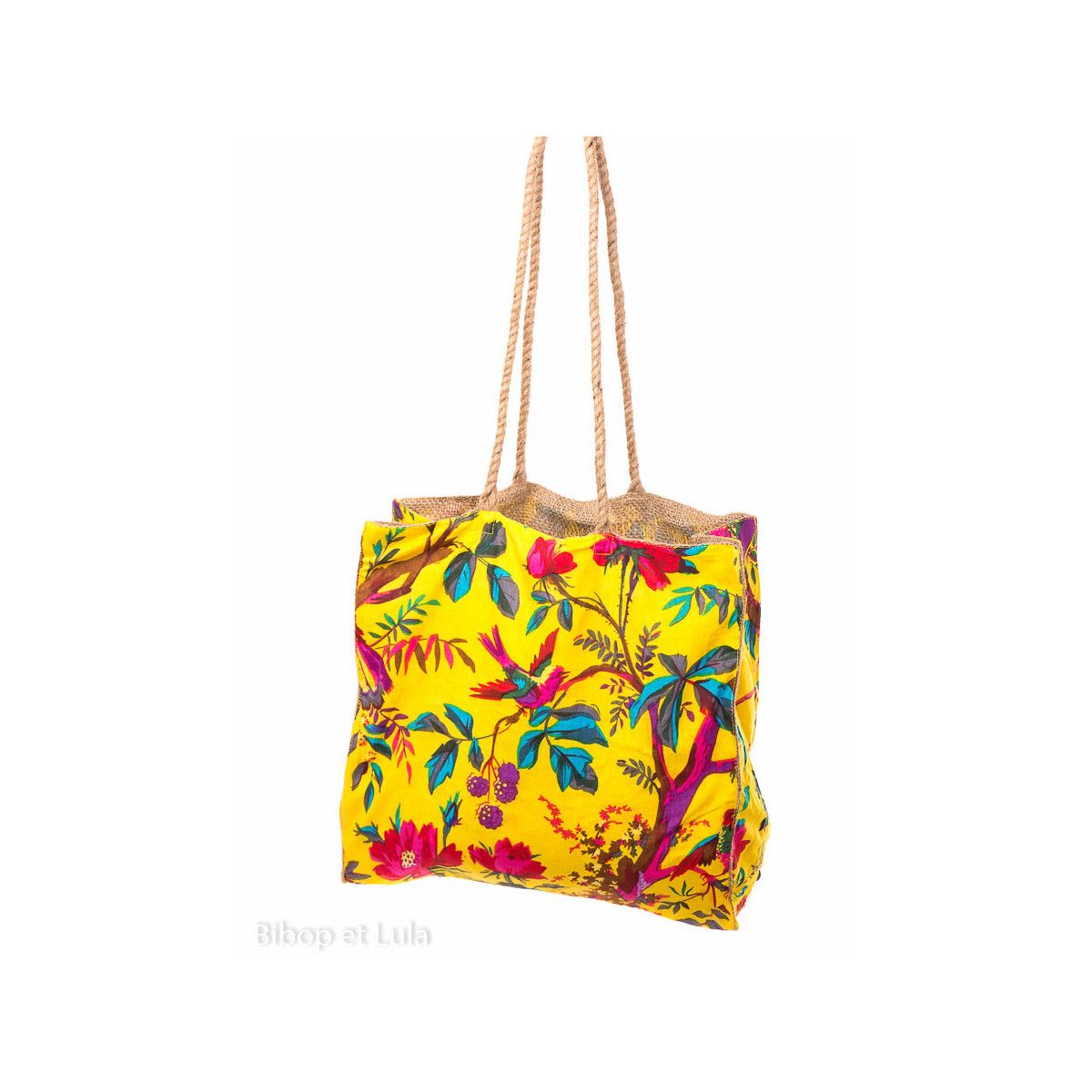 Extérieur en coton imprimé, intérieur et anses en toile de jute souple .