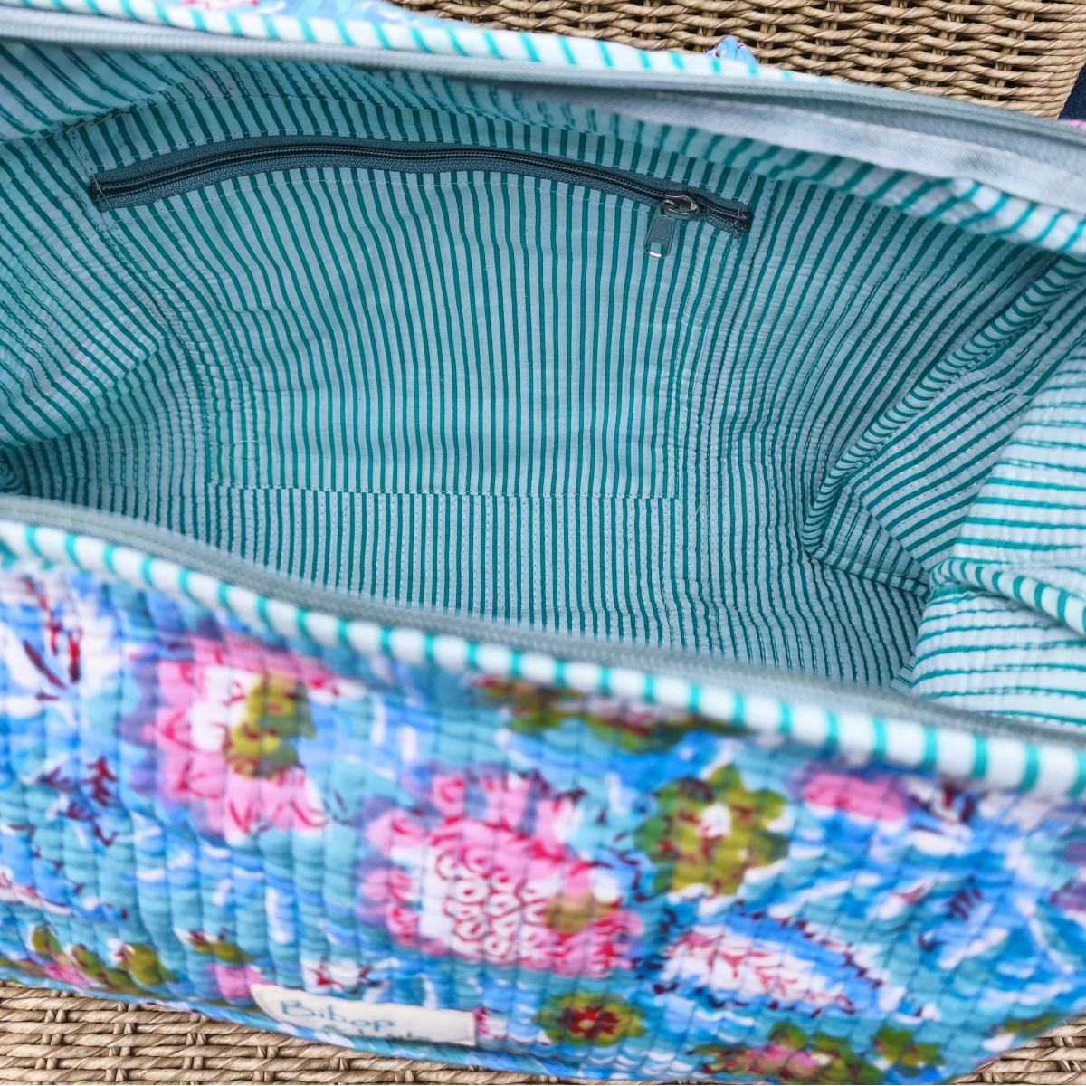 Conçu dans un tissu coton indien block print doux et résistant, il séduit par son imprimé fleuri bleu et rose.