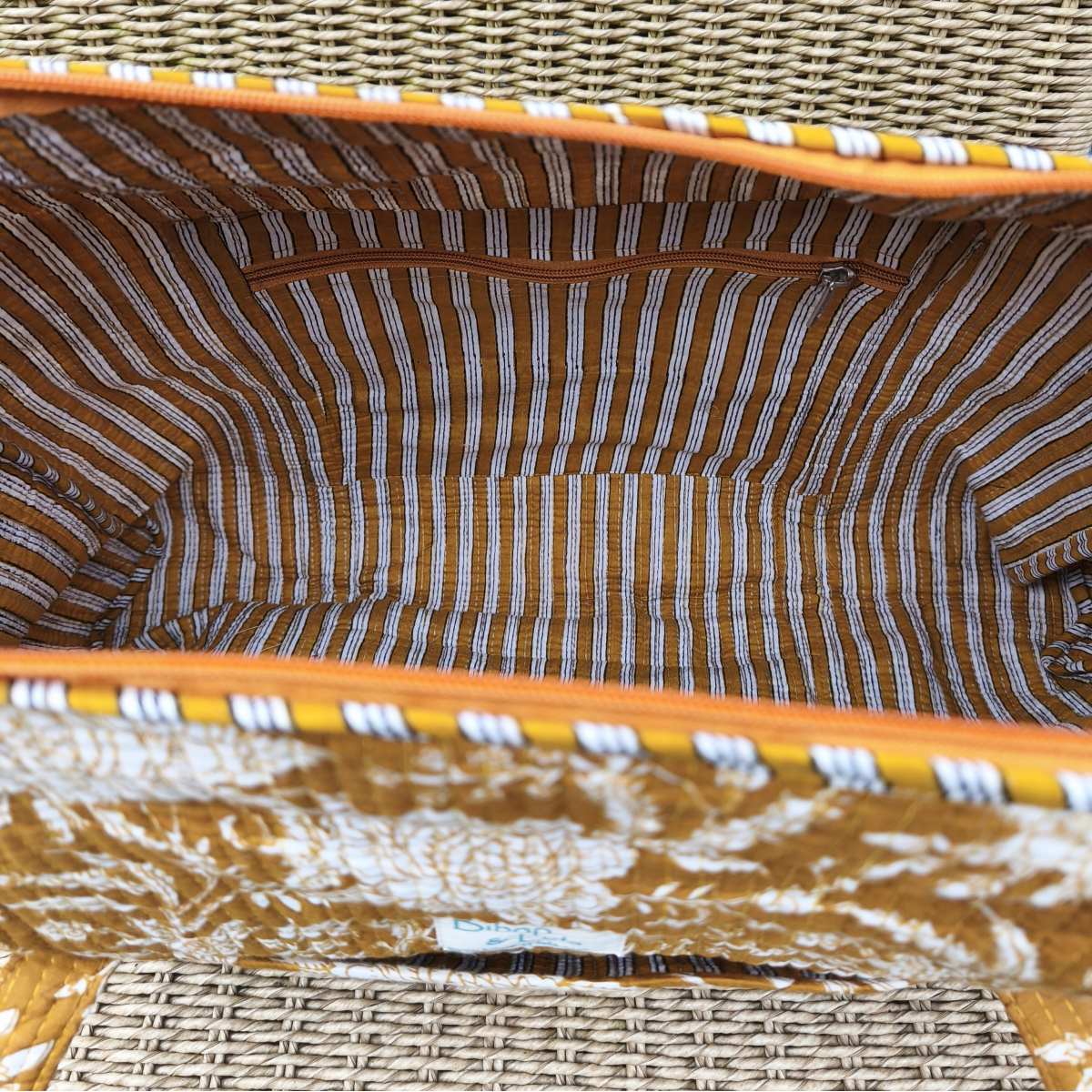 Conçu dans un tissu coton indien block print doux et résistant, il séduit par son imprimé fleuri orange et blanc.