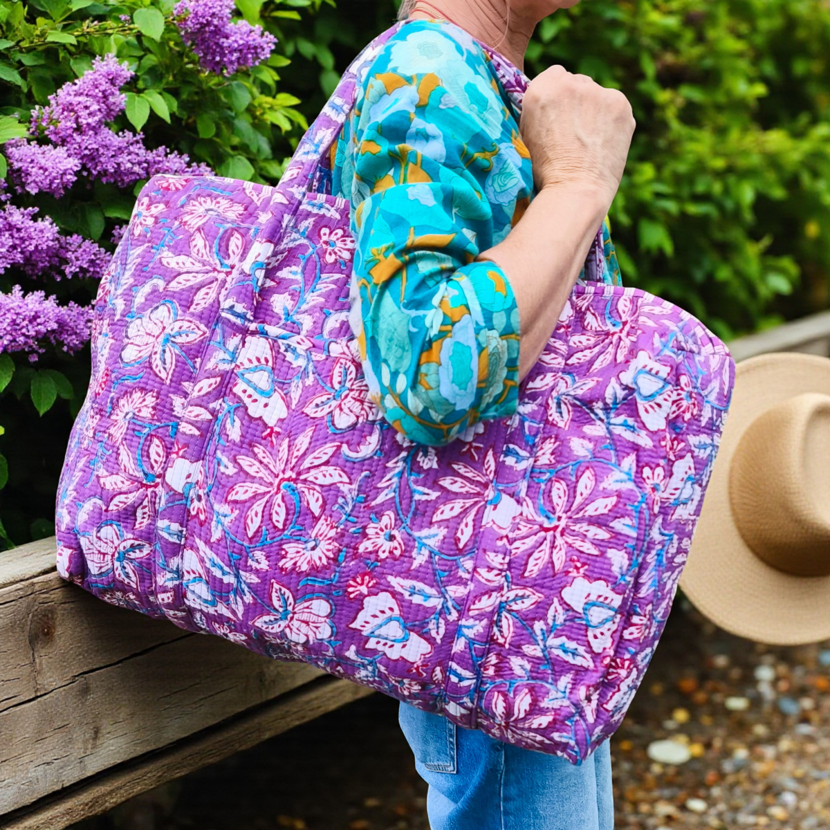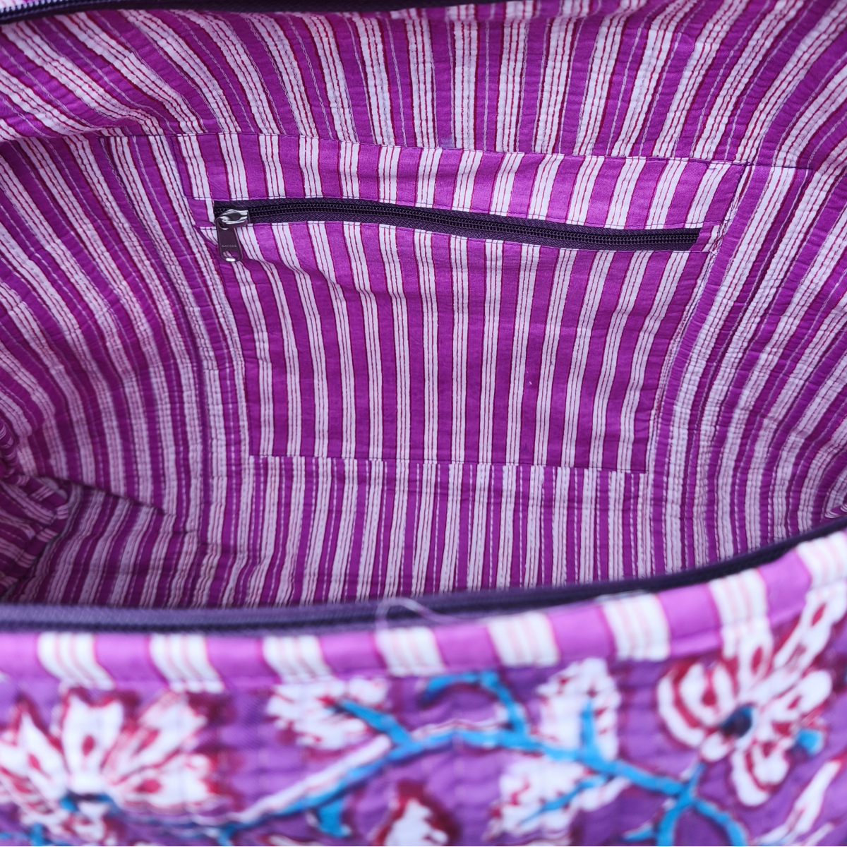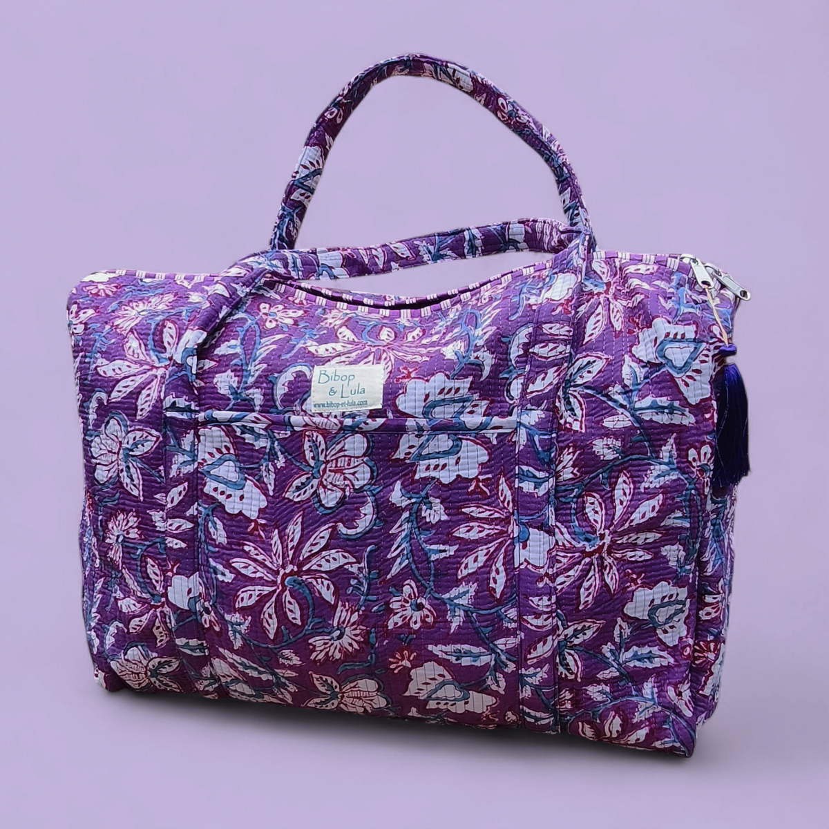 Conçu dans un tissu coton indien block print doux et résistant, il séduit par son imprimé fleuri violet et bleu.
