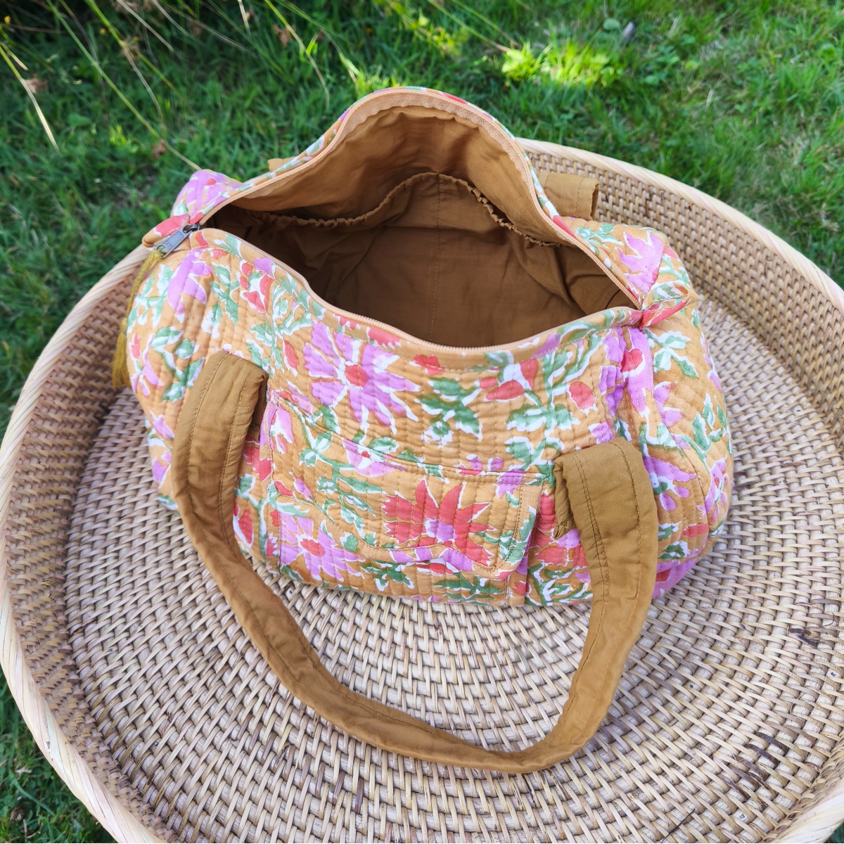 Sac en coton orange matelassé imprimé à fleurs rose et rouge