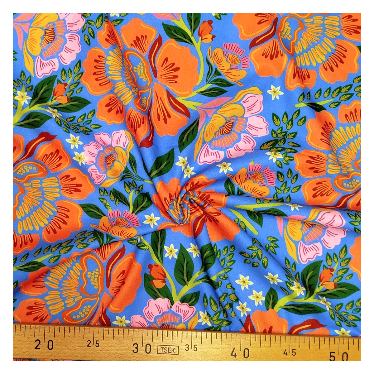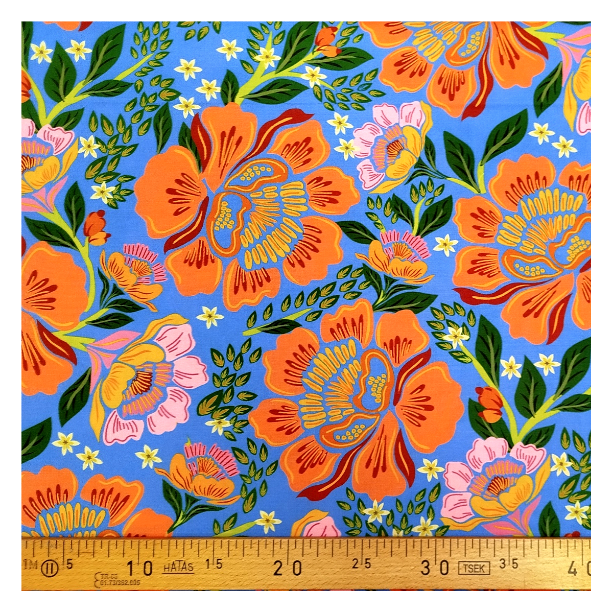 De grosses fleurs rose orangé et du feuillage d'un vert intense sur fond bleu donnent à ce tissu coton un éclat incomparable.