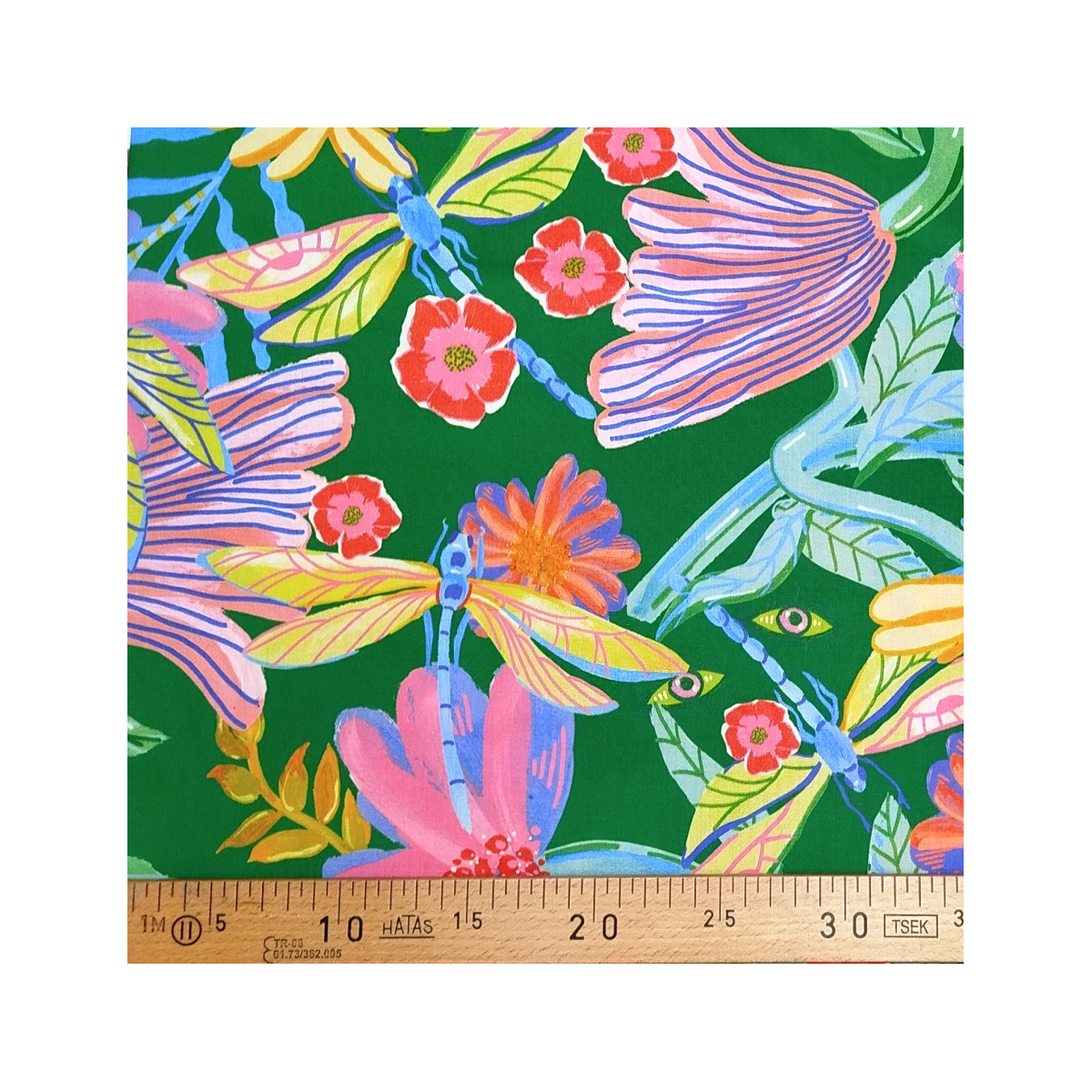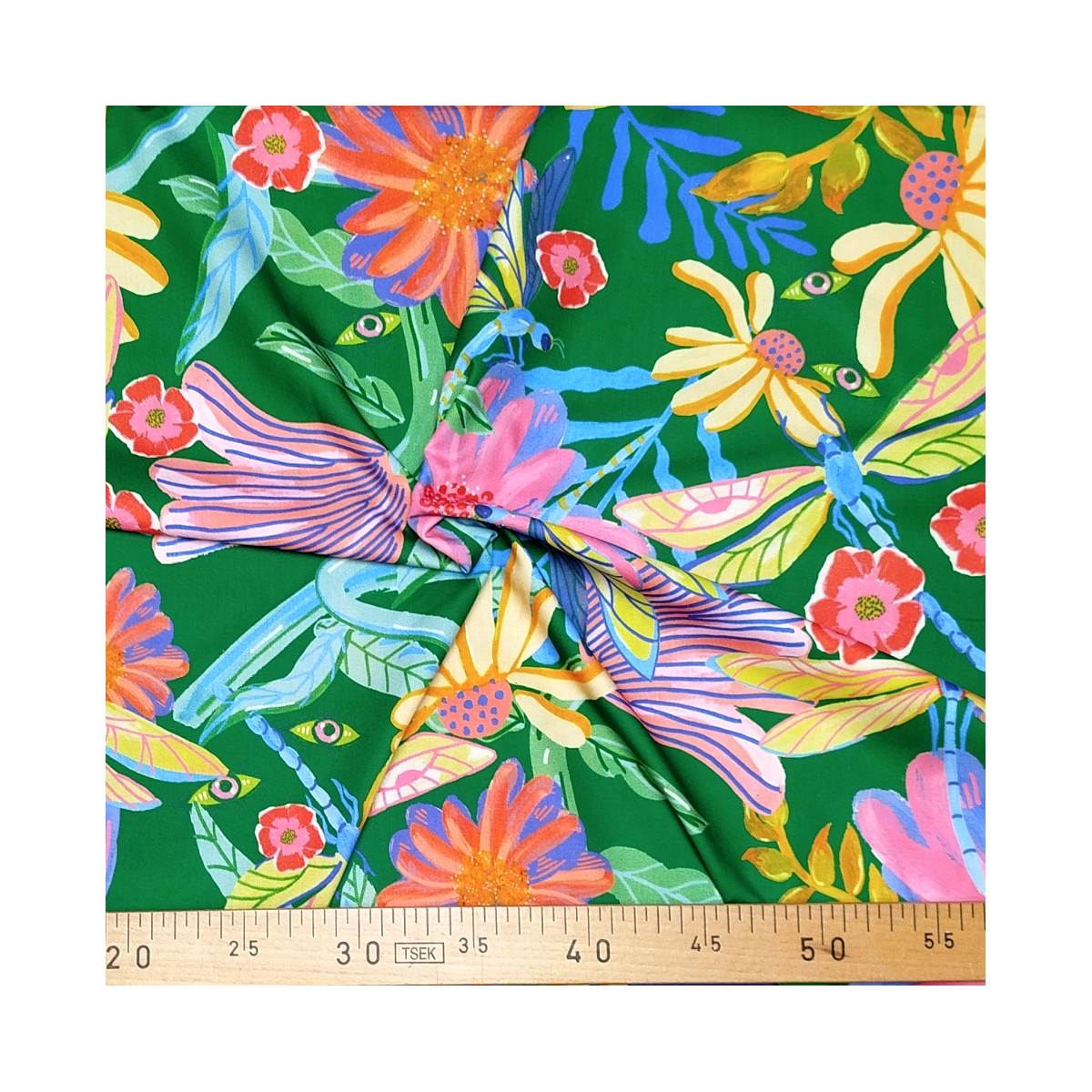 De grosses fleurs , des libellules et un regard qui se fond dans le paysage vert intense donnent à ce tissu coton un éclat incomparable.
