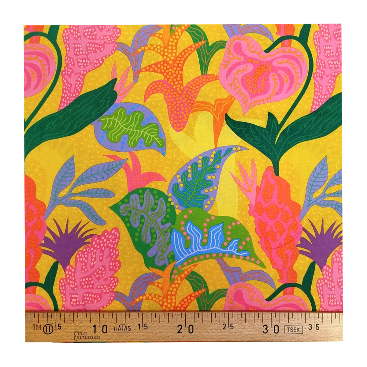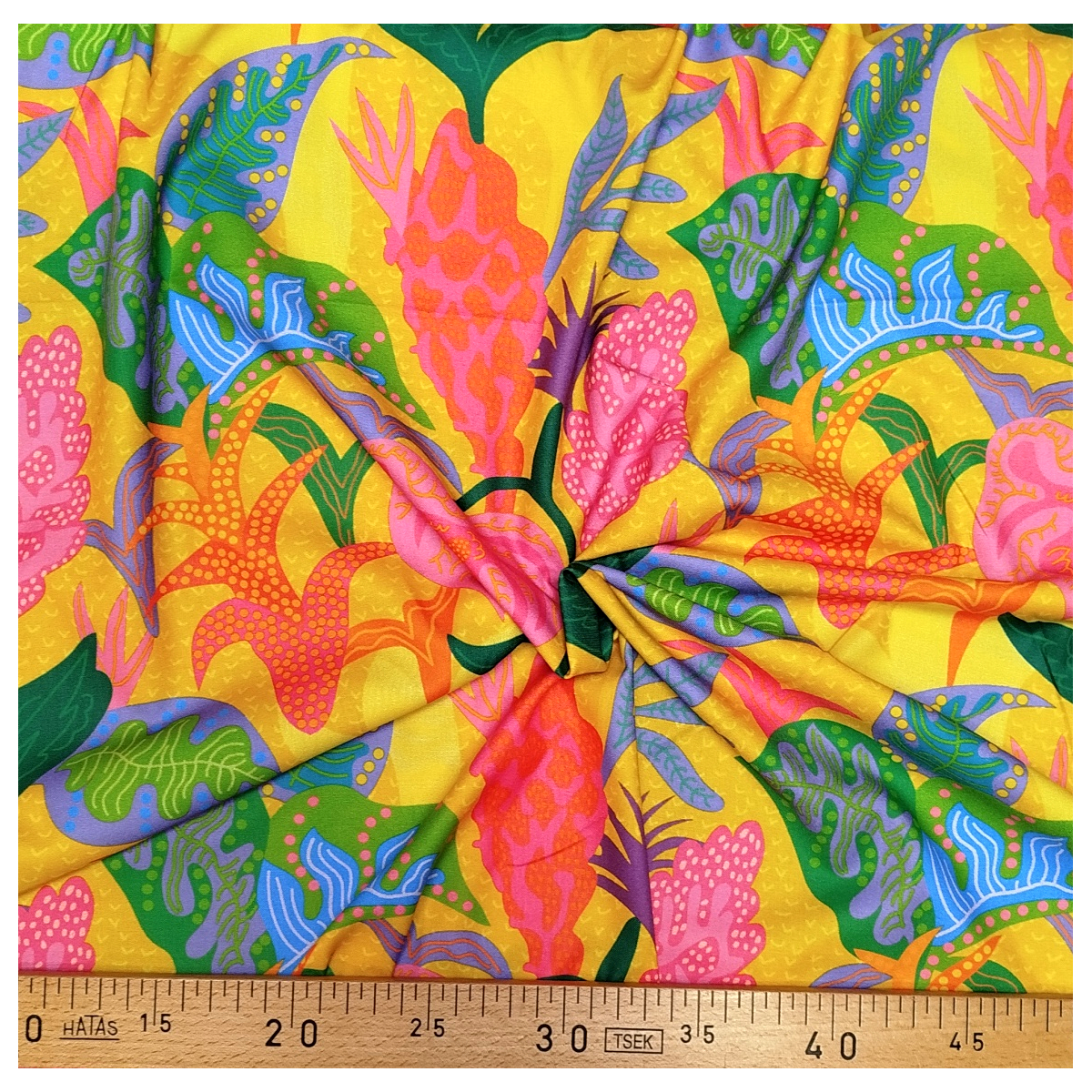 Une végétation abondante aux couleurs intenses sur fond jaune donnent à ce tissu un éclat incomparable. Fondrez -vous pour ces couleurs intenses ?