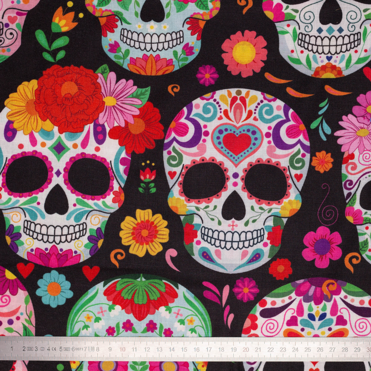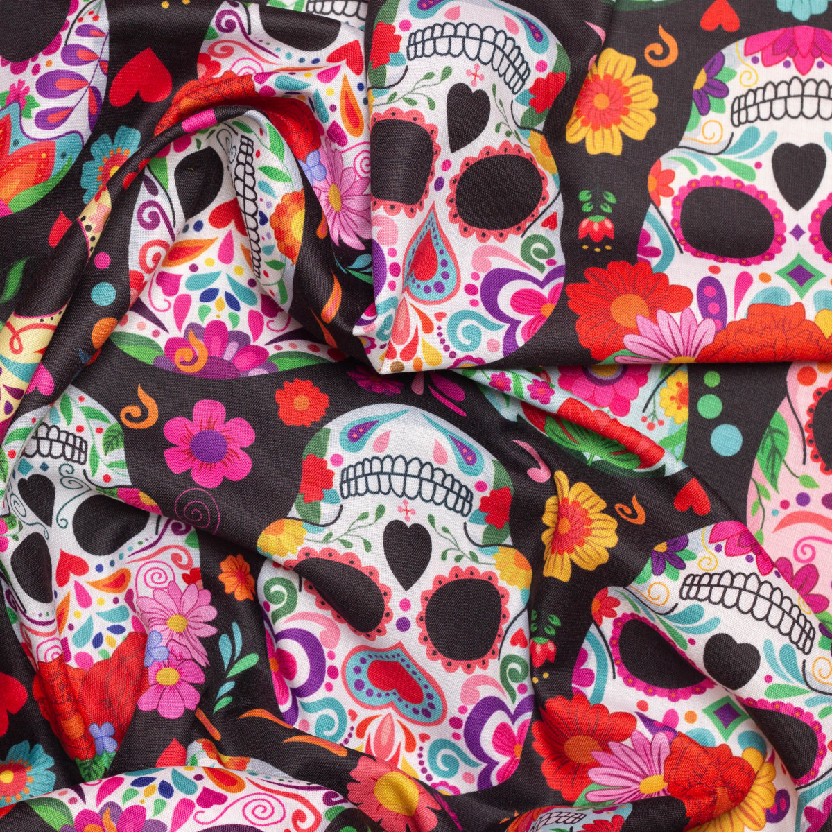 Inspiré de l’univers coloré du Día de los Muertos, il associe des crânes décorés de fleurs, de cœurs et de motifs floraux multicolores sur fond noir.