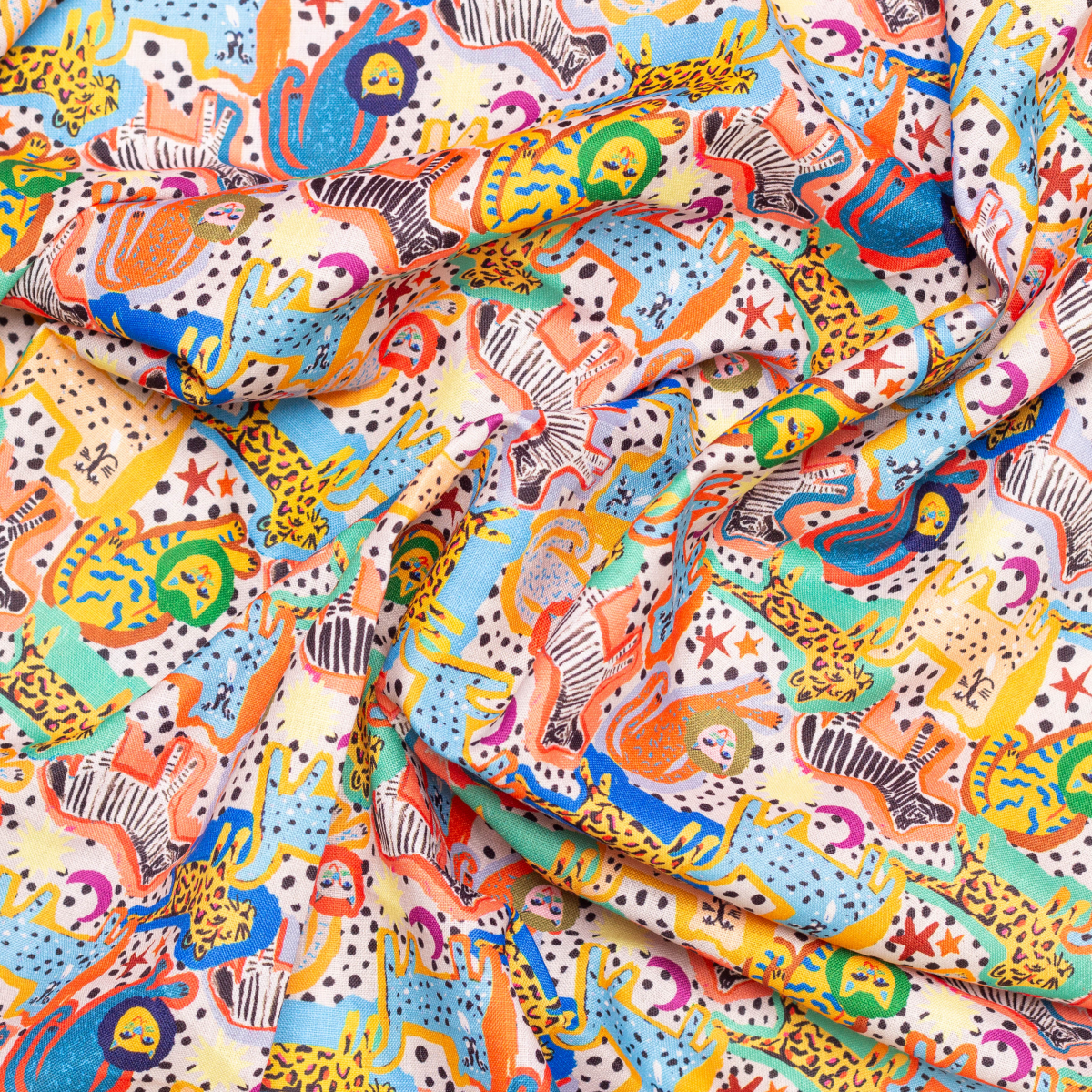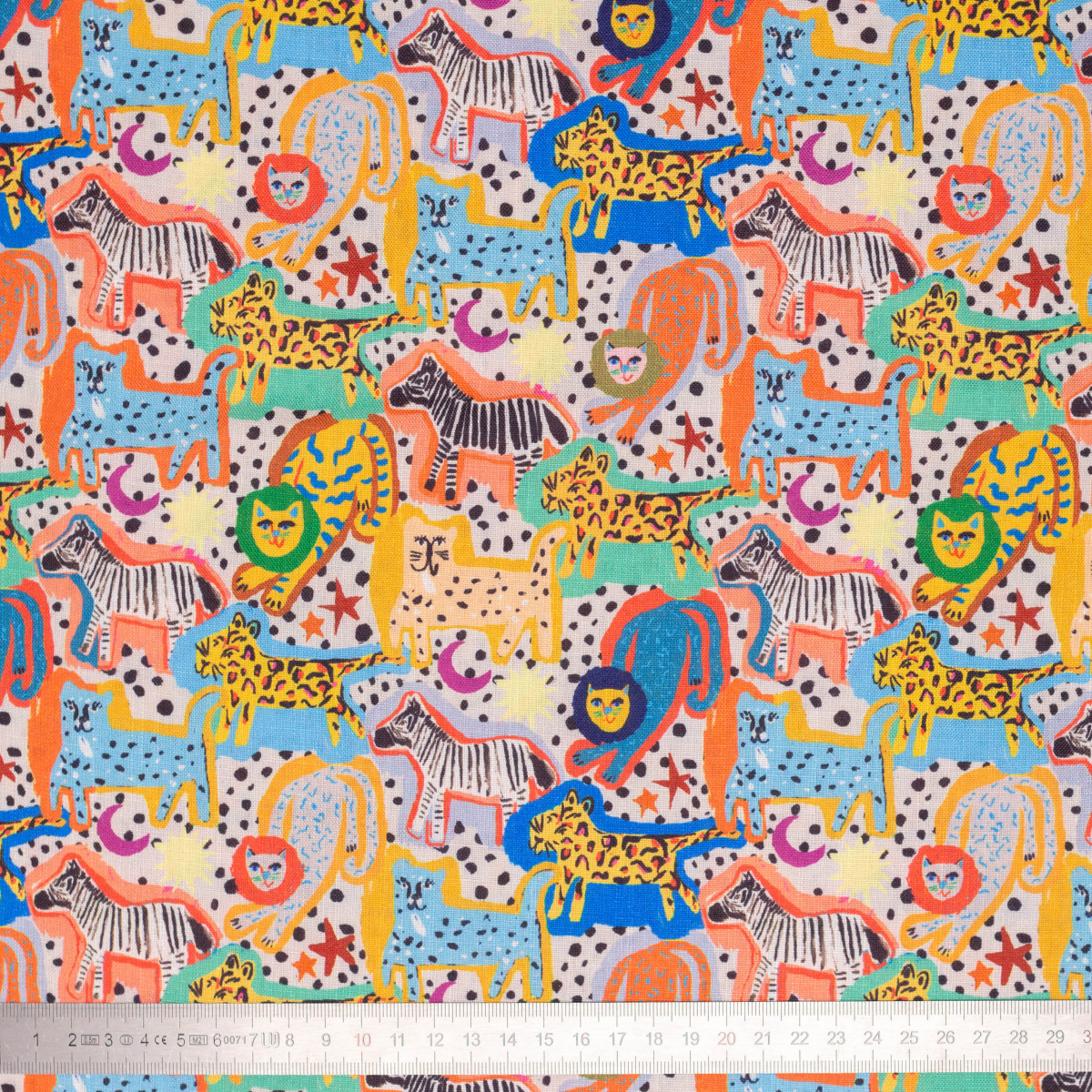 Apportez une touche originale et festive à vos créations avec ce tissu coton/lin imprimé animaux de la savane ( lion, zébre..) et croissant de lune et soleil.