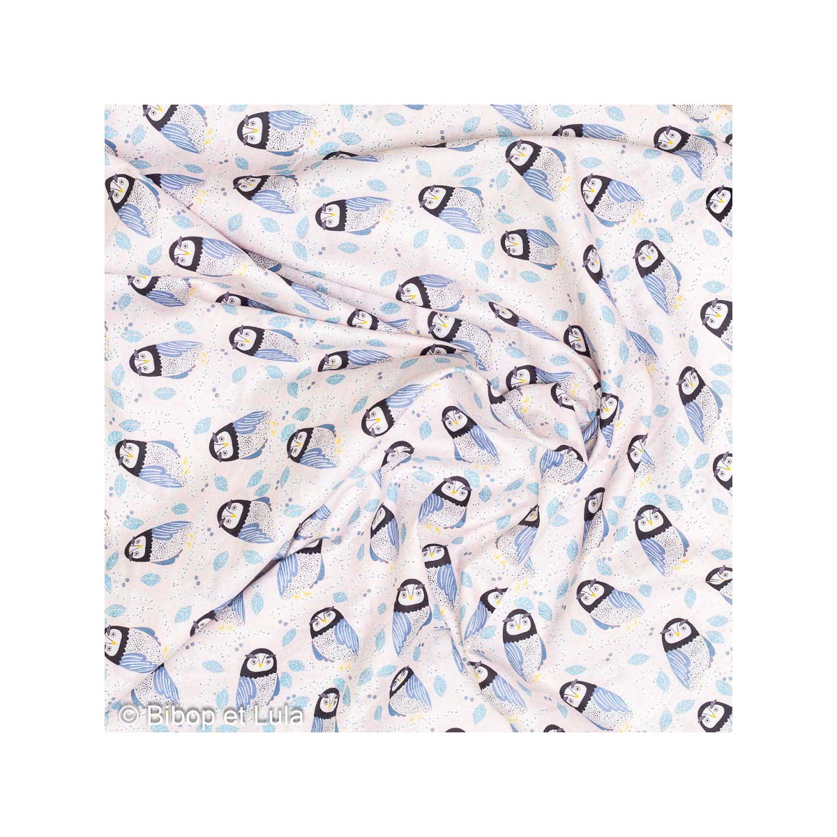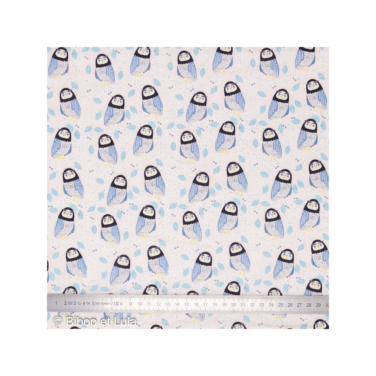 Tissu coton fond rose pâle imprimé hiboux et feuille bleu
