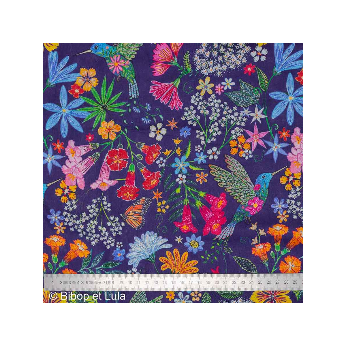 Le tissu coton Temanu, au fond bleu imprimé de fleurs élégantes, papillons et colibris sera parfait pour confectionner vos robes, doublures de vestes, sacs, pochettes...