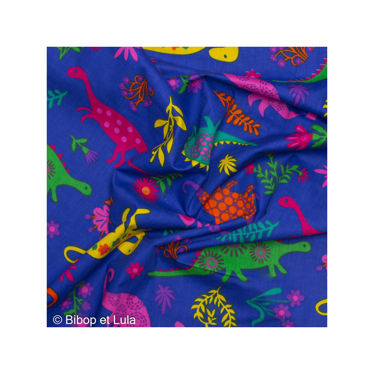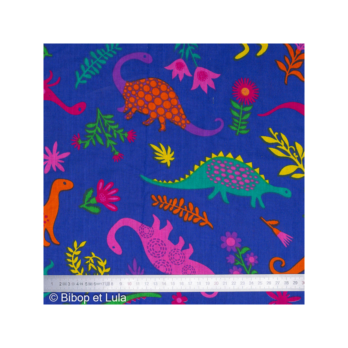 Son motif dinosaure orange , rose, vert et violet entouré de fleurs sur un fond bleu roi apporte une touche pétillante à toutes vos créations couture.