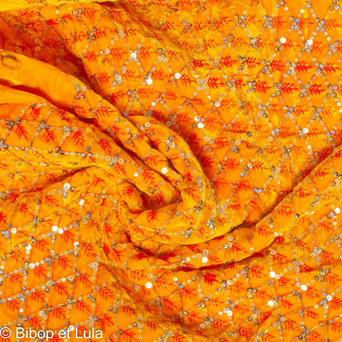 Craquez pour l'un de nos tissus Bollywood en velours! Tout en relief et tout en douceur ce tissu est délicatement brodé de sequins et de fils dorés.