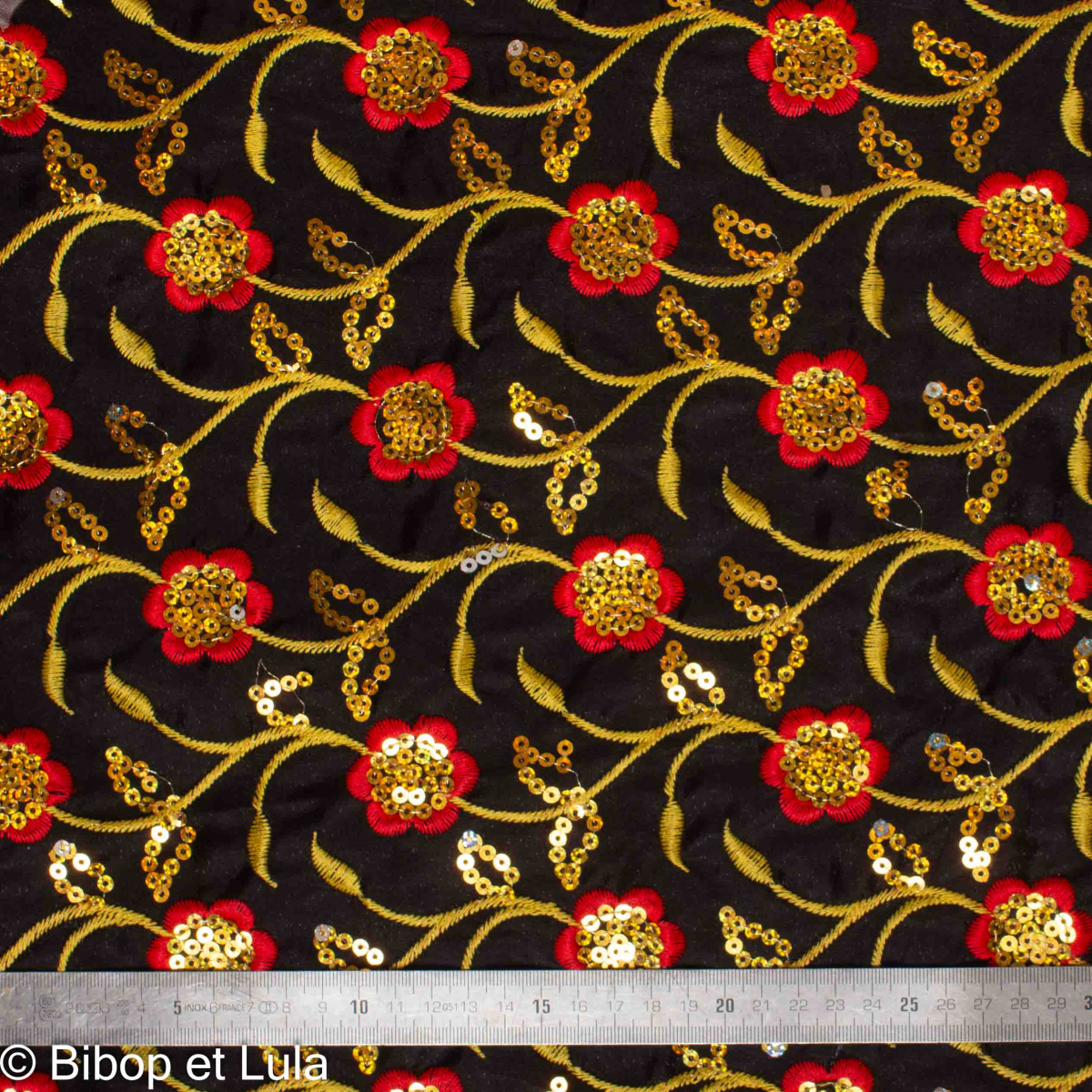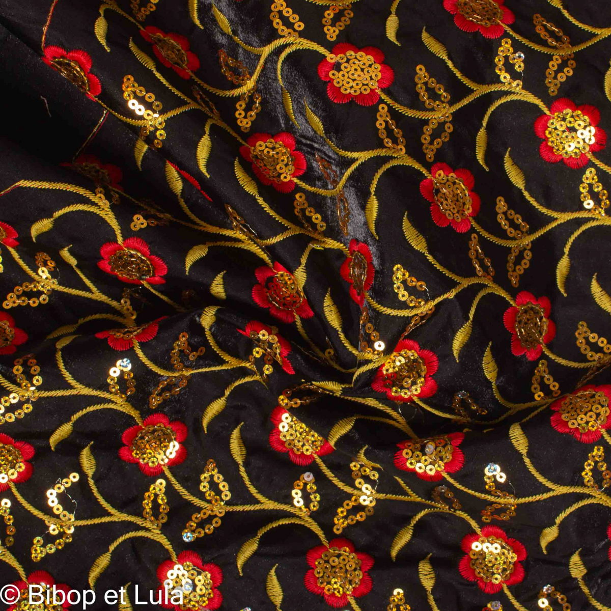 Craquez pour l'un de nos tissus Bollywood ! Tout en relief, ce tissu est délicatement brodé de sequins, de fils dorés et motifs floraux colorés sur un fond noir.