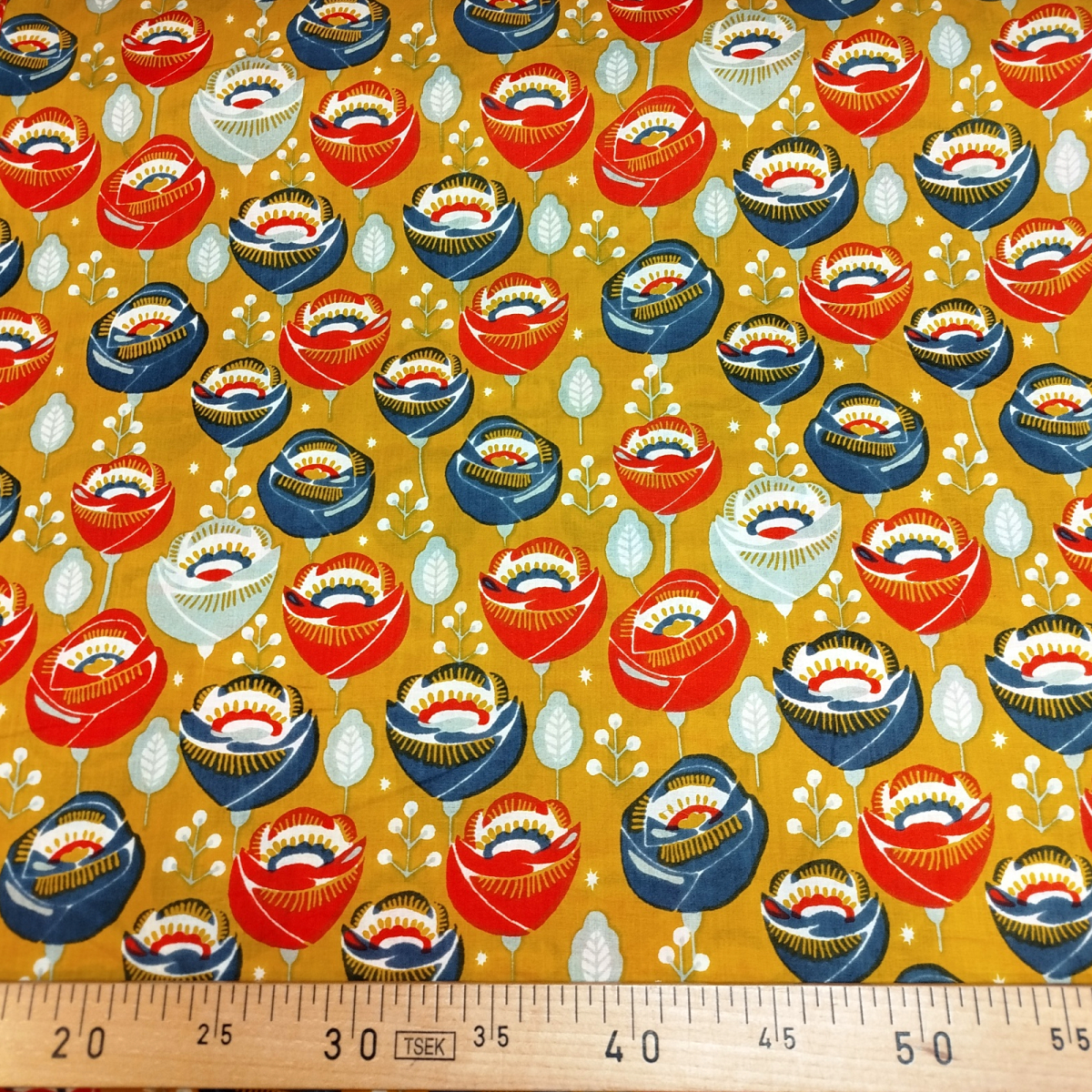 Avec son fond ocre lumineux et ses tulipes rouges, grises et bleues pleines de contraste, il apporte une touche joyeuse à toutes vos créations couture.