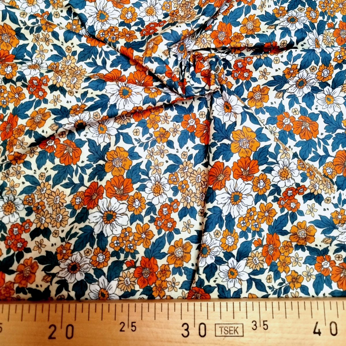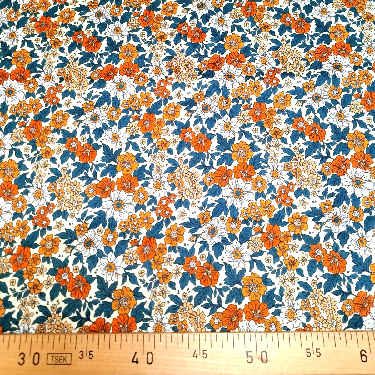 Tissu coton écru motif floral vert et orange
