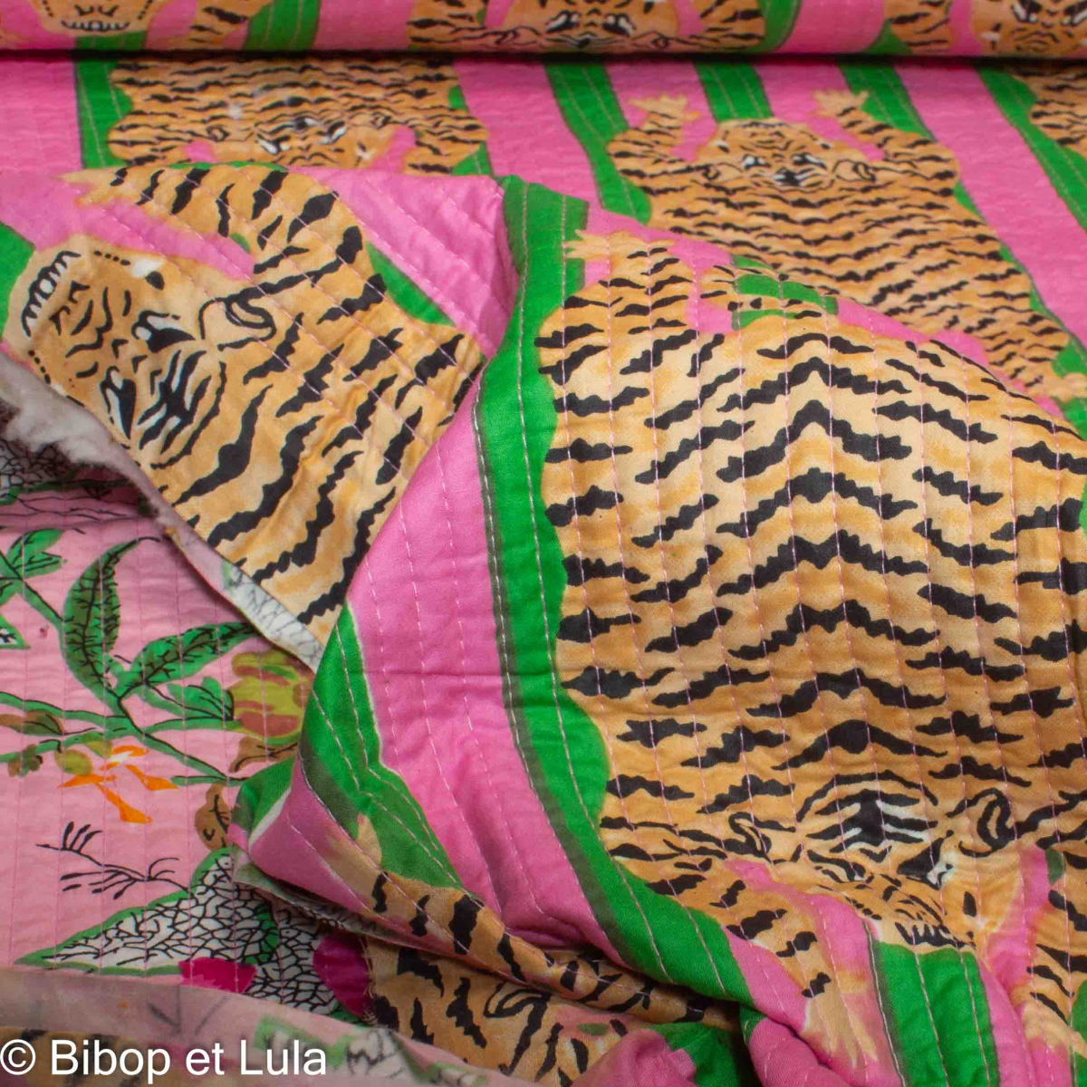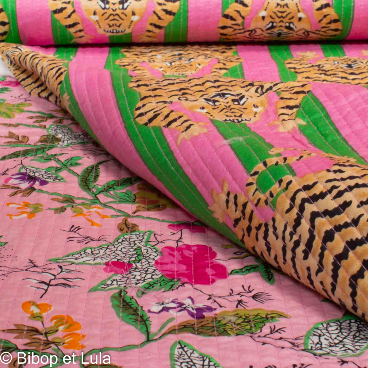 Craquez pour ces motifs aux couleurs vives : d'un coté des tigres sur fond rayé vert et rose , et de l'autre un magnifique motif floral aérien et coloré sur fond rose.