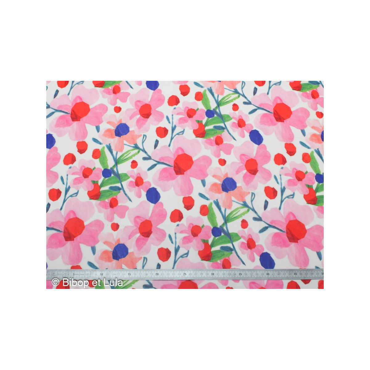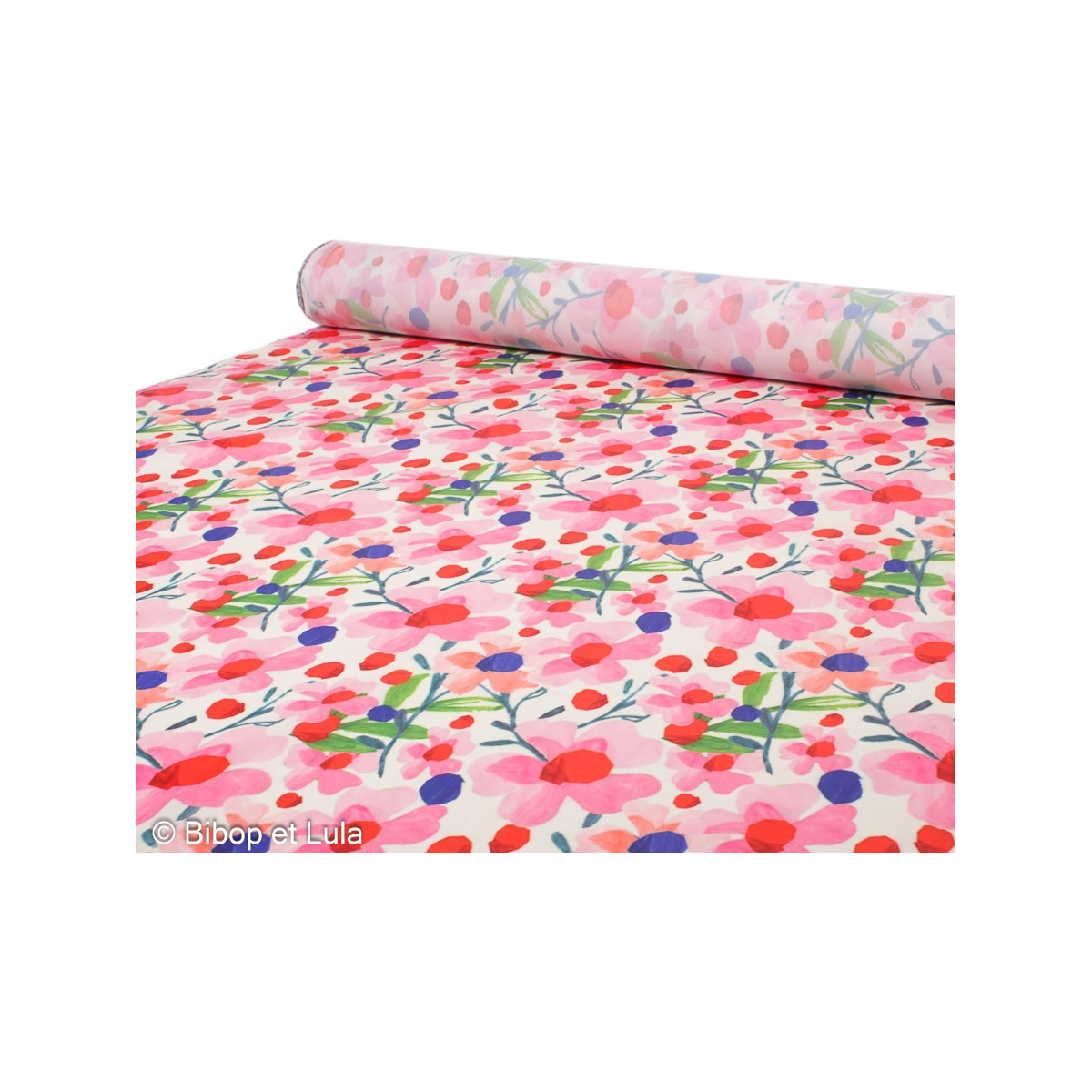 Ce tissu enduit fleuri présente de jolies fleurs aux tons roses, rouges et violets, mises en valeur par un fond clair lumineux.