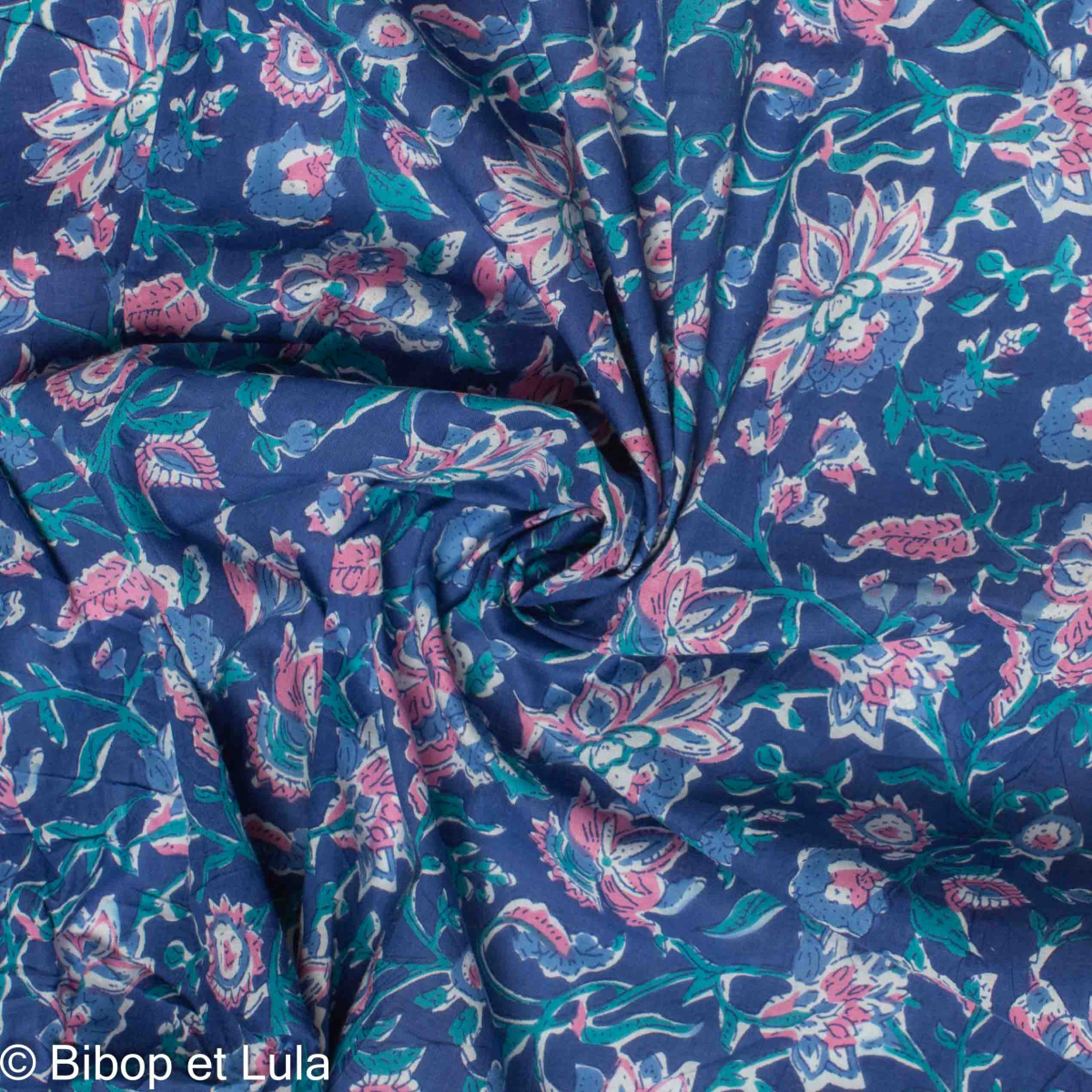 Tissu en coton indien Chhui au mètre. Son magnifique fond bleu profond est rehaussé de motifs floraux roses, turquoise et blancs, imprimés artisanalement au tampon de bois à Jaipur.