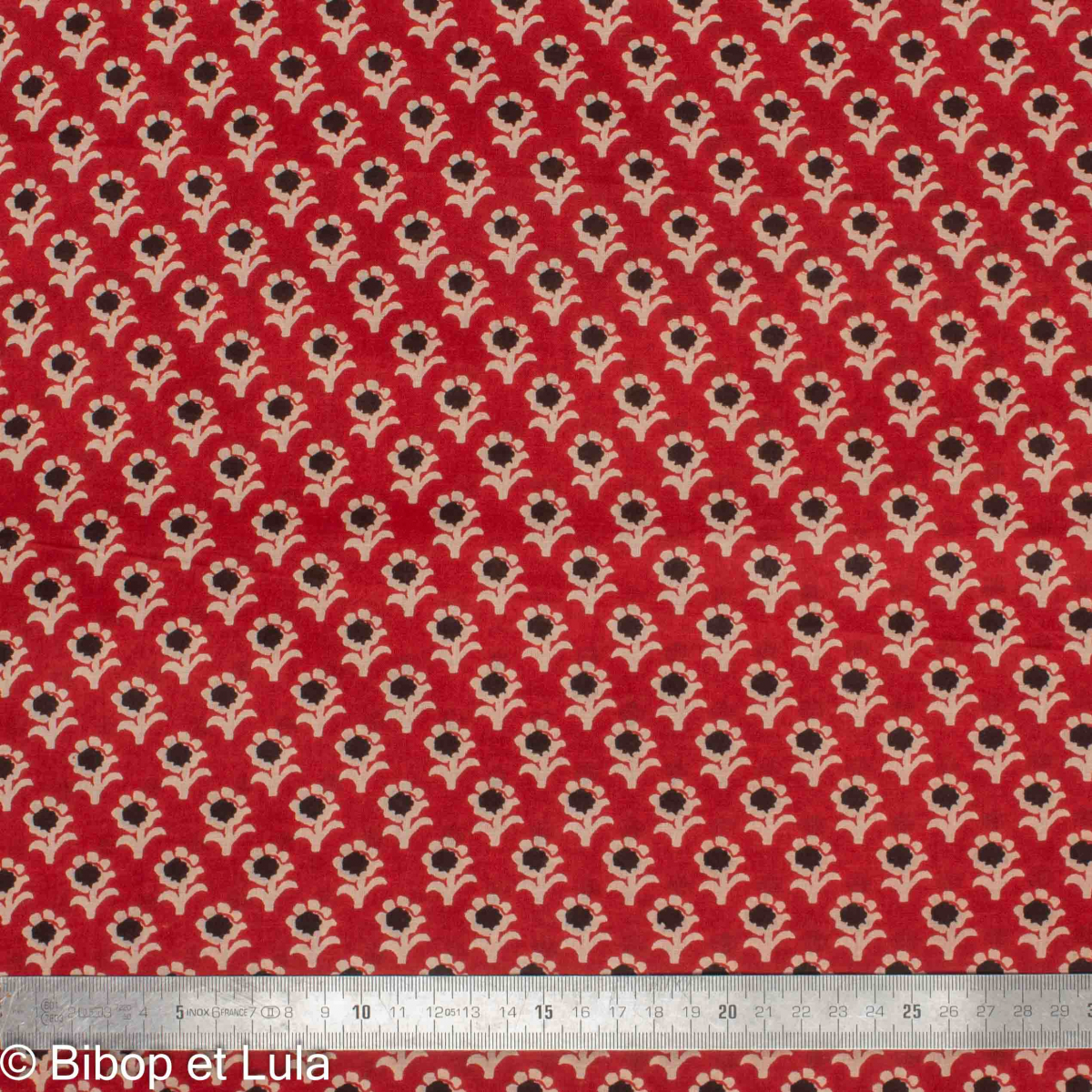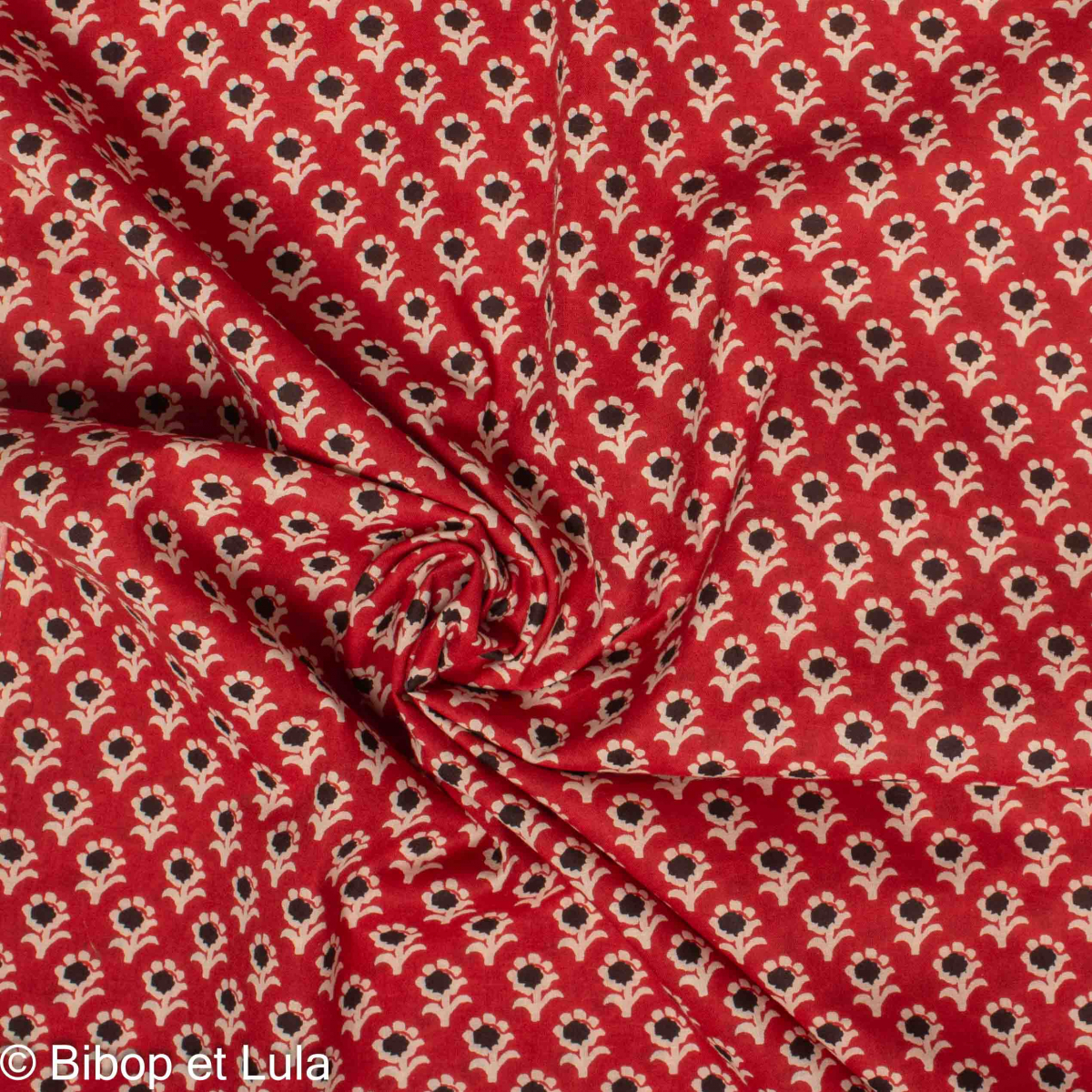 Tissu en coton indien Silari au mètre. Son motif répétitif élégant, composé de petites fleurs noires et ivoire sur un fond rouge profond, est imprimé artisanalement à Jaipur grâce à la technique traditionnelle du tampon de bois.