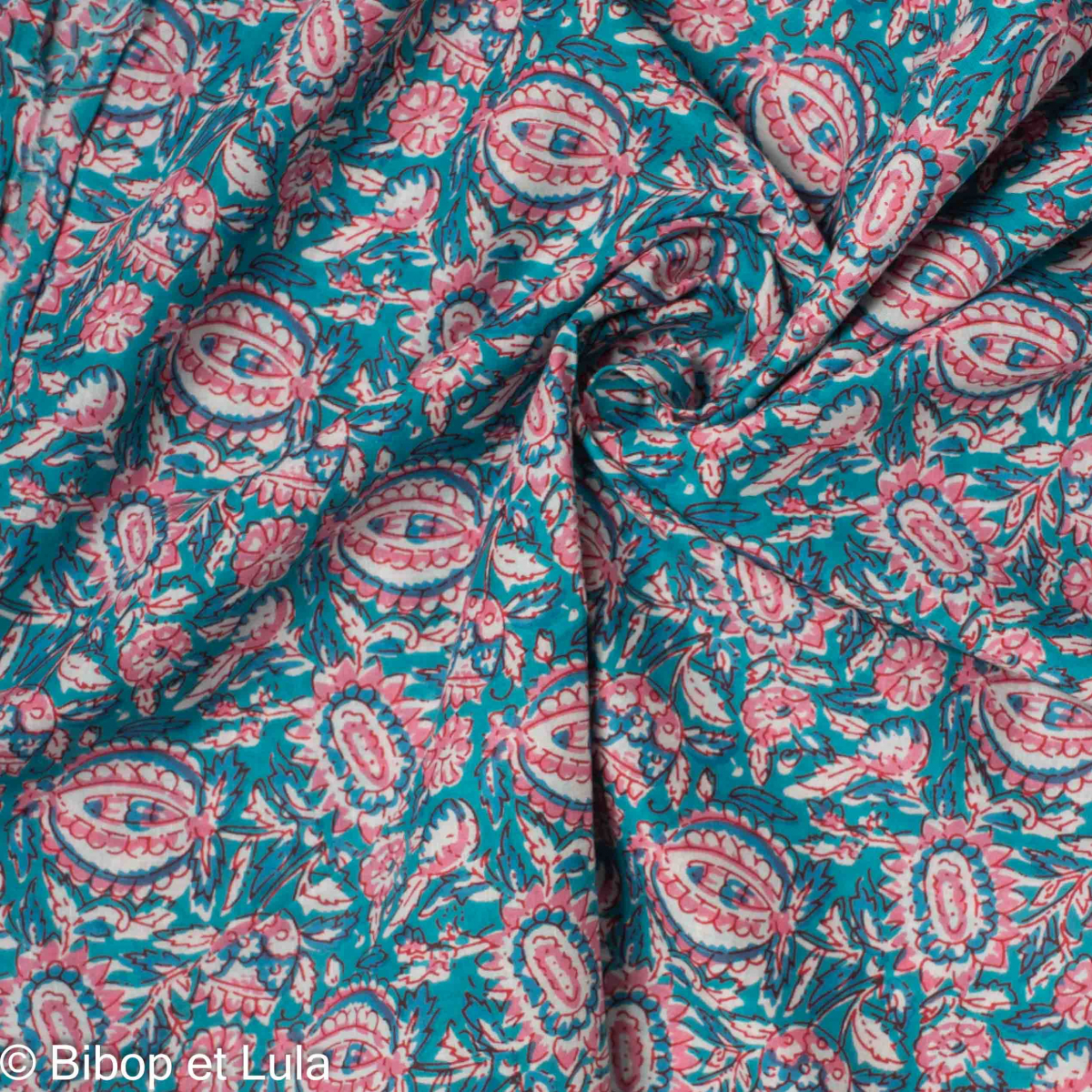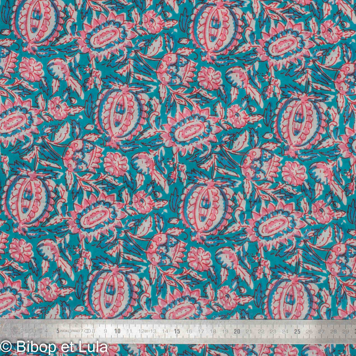 Tissu en coton indien Paanee au mètre. Sur un fond turquoise lumineux, de superbes motifs floraux et cachemire stylisés s’expriment en rose tendre, fuchsia et blanc, rehaussés de touches bleu nuit.