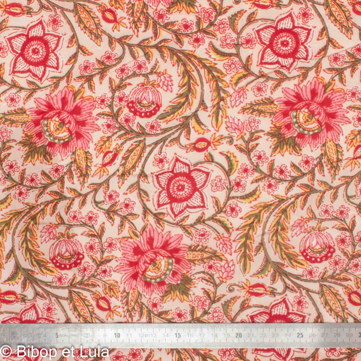 Tissu en coton indien Mathar au mètre. Sur un fond beige rosé lumineux, de délicats motifs floraux se déclinent en rose profond, rouge framboise, jaune safran et touches d’ocre, le tout imprimé artisanalement au tampon de bois à Jaipur.