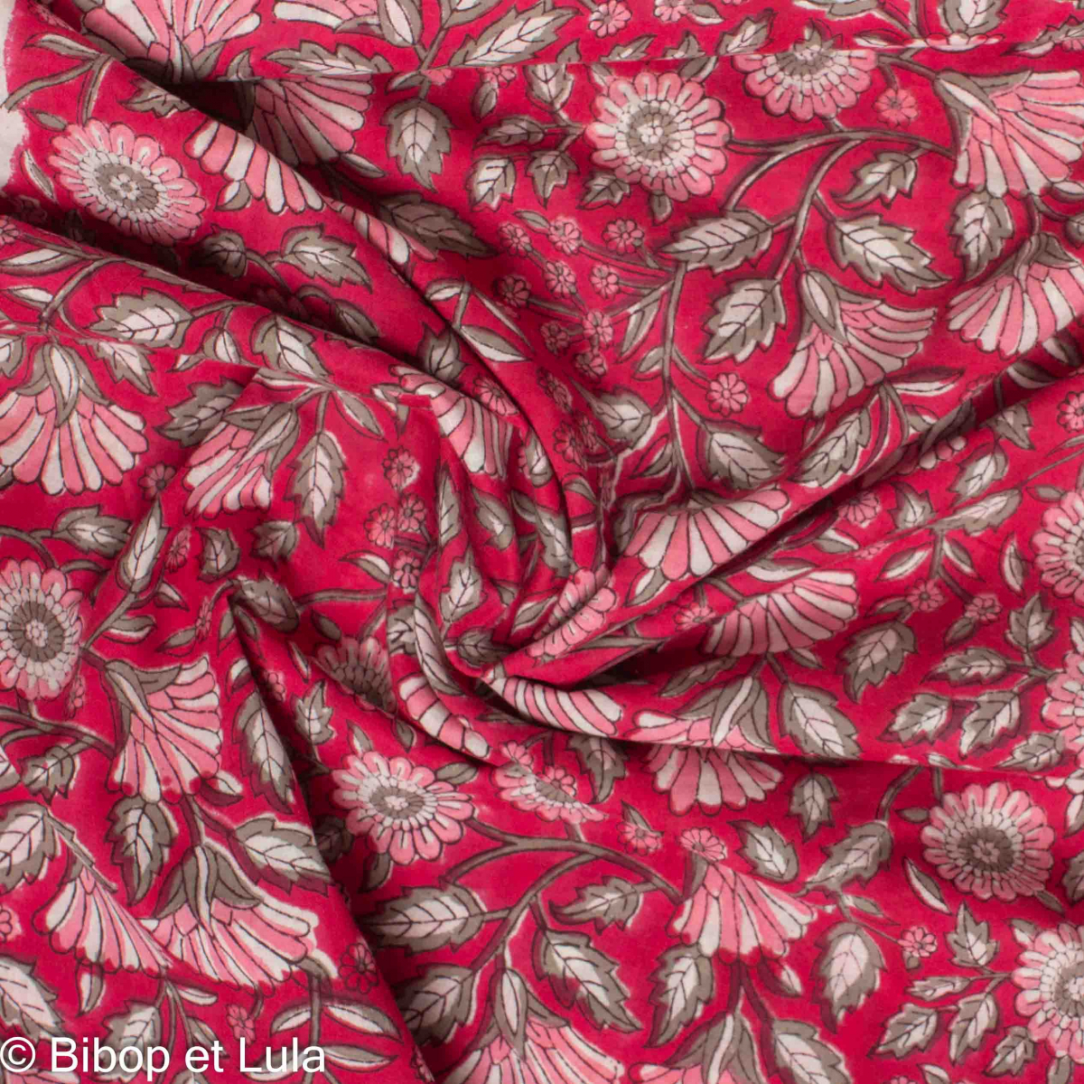 Découvrez Dinni, un tissu indien block print au mètre sublimé par un fond rose framboise profond, orné de fleurs artisanales dans des tons rose pâle, beige, et taupe. Léger et agréable à coudre, il sera parfait pour réaliser des blouses, jupes, robes fluides ou accessoires uniques.