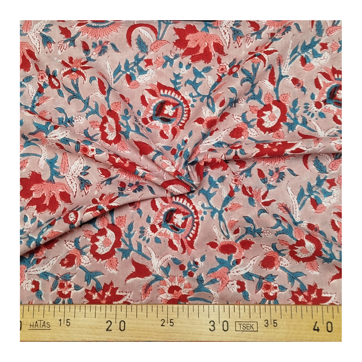 Un fond vieux rose clair orné d'un motif floral rouge, rose et turquoise donnent à ce tissu une douceur pleine de caractère.