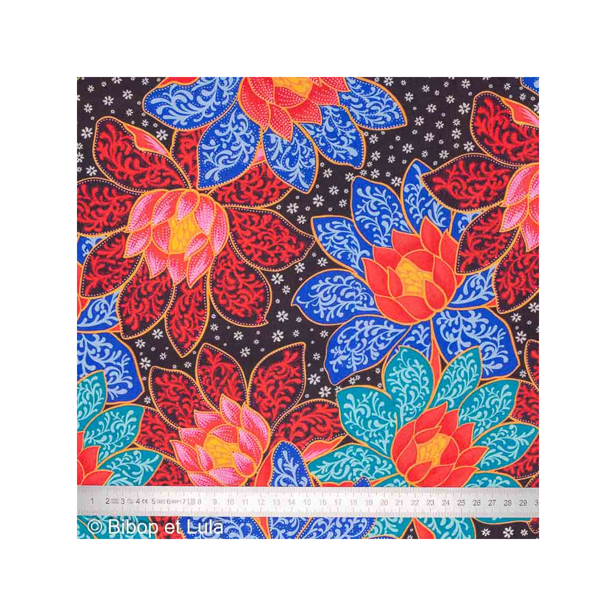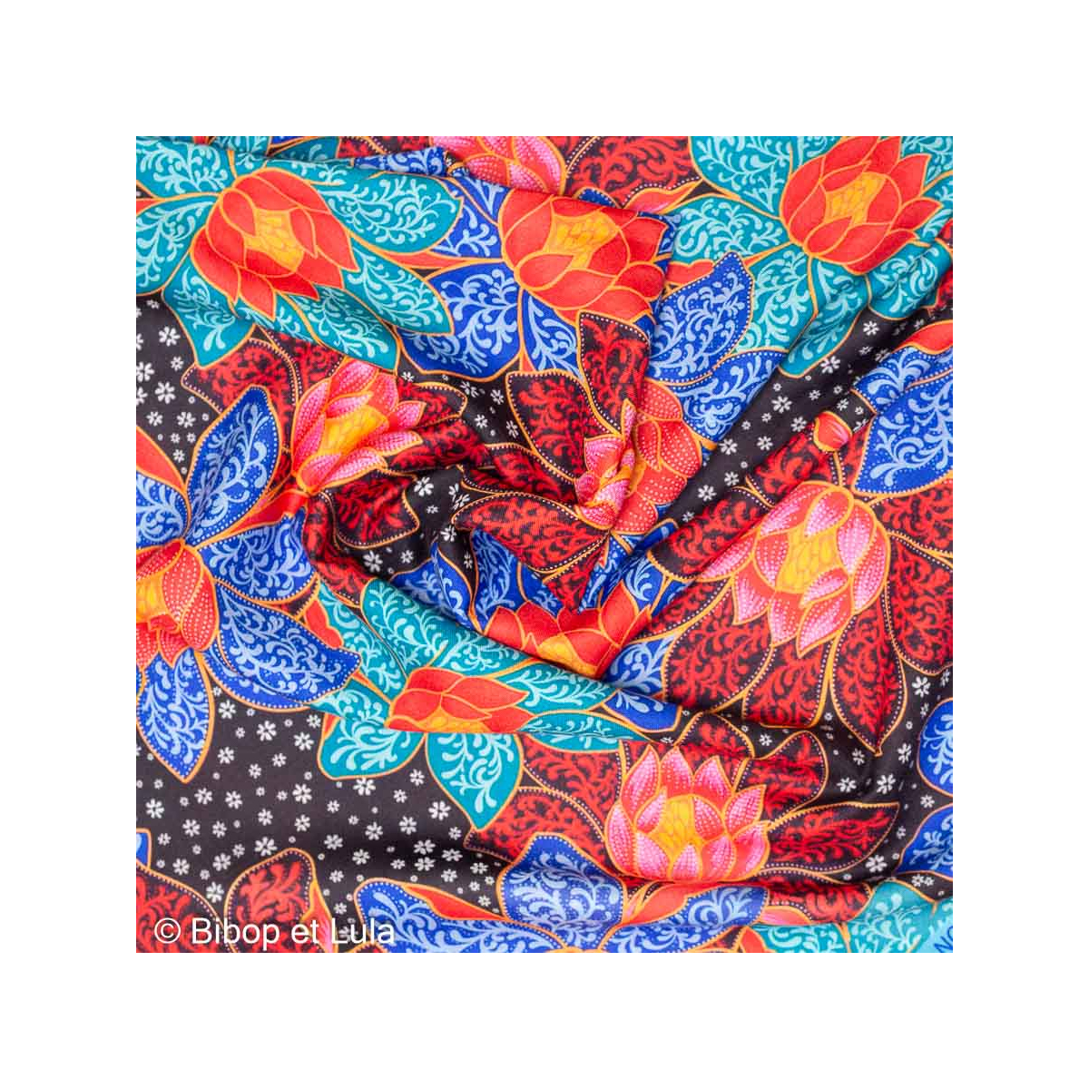 Un motif floral raffiné de lotus turquoise, bleu et orange se détache sur un fond noir, apportant fraîcheur et raffinement à vos tenues.