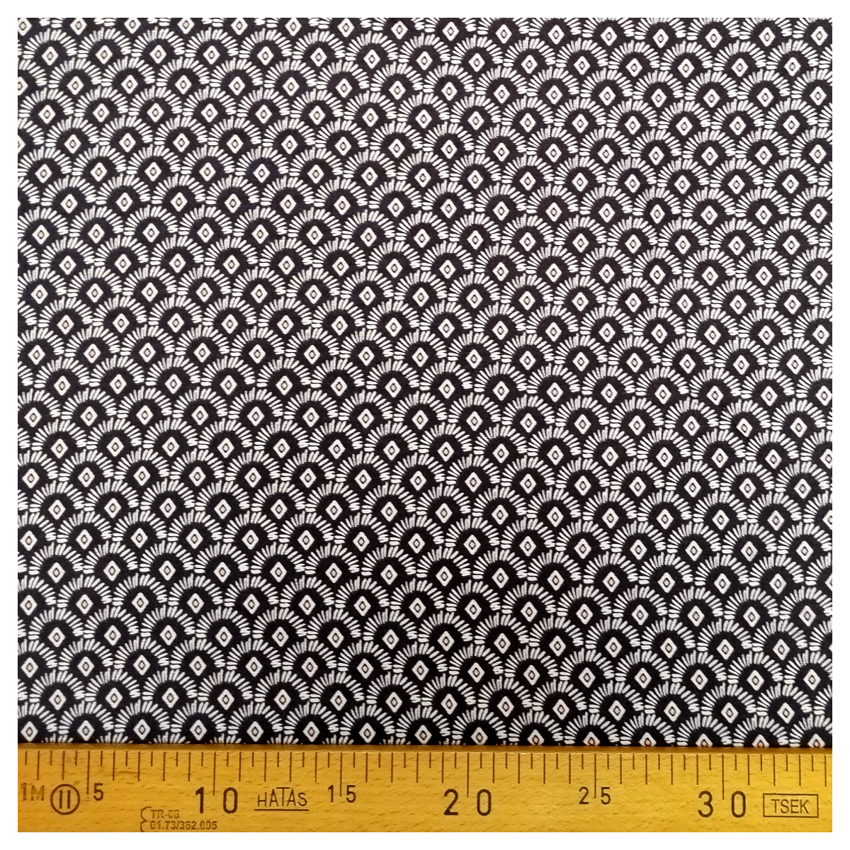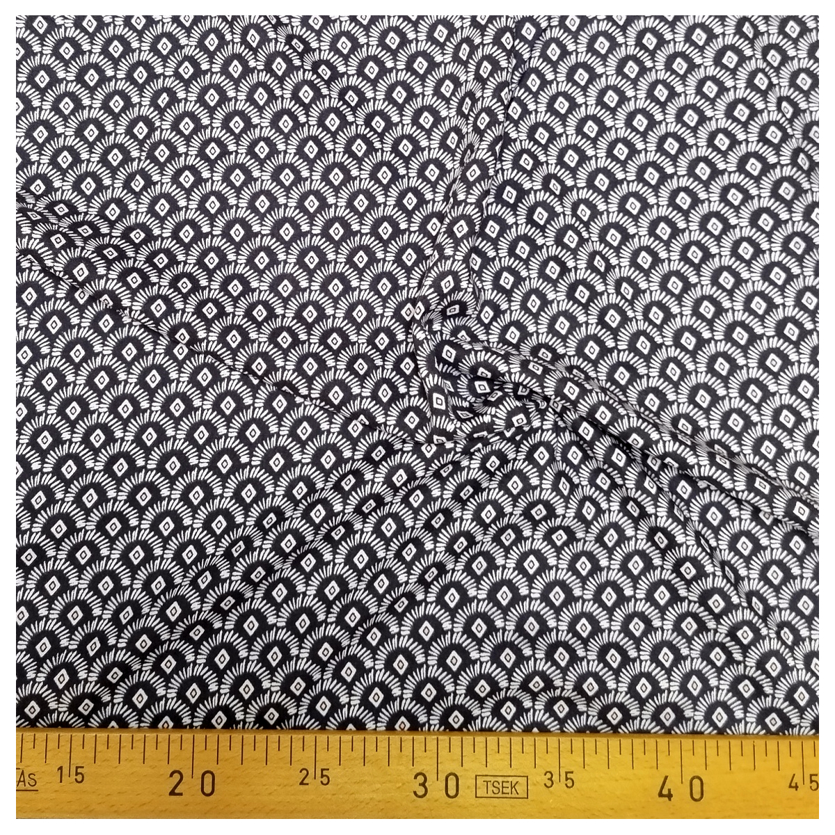 Tissu viscose marine au motif géométrique gris bleu et saumon lumineux
