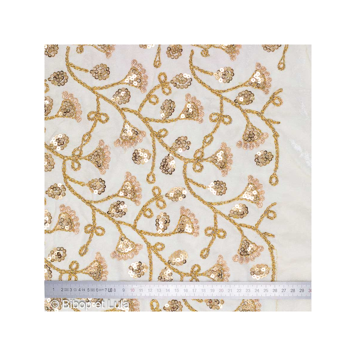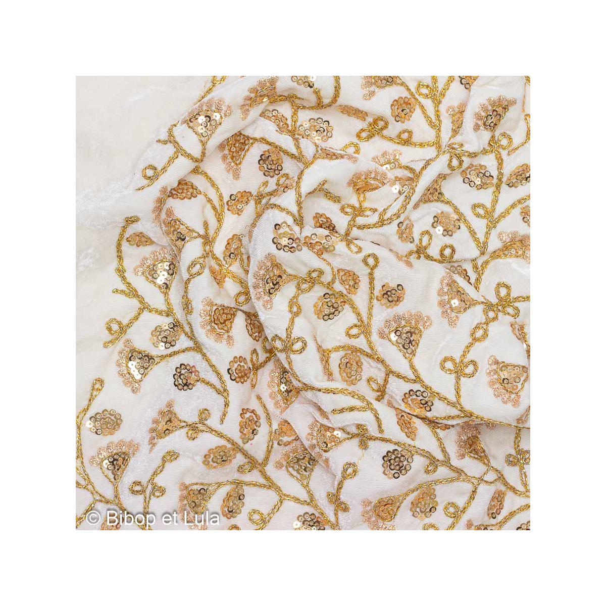 Apportez une touche d’élégance et de douceur à vos créations avec notre velours Bollywood au motif floral , brodé de fils dorées et sequins.